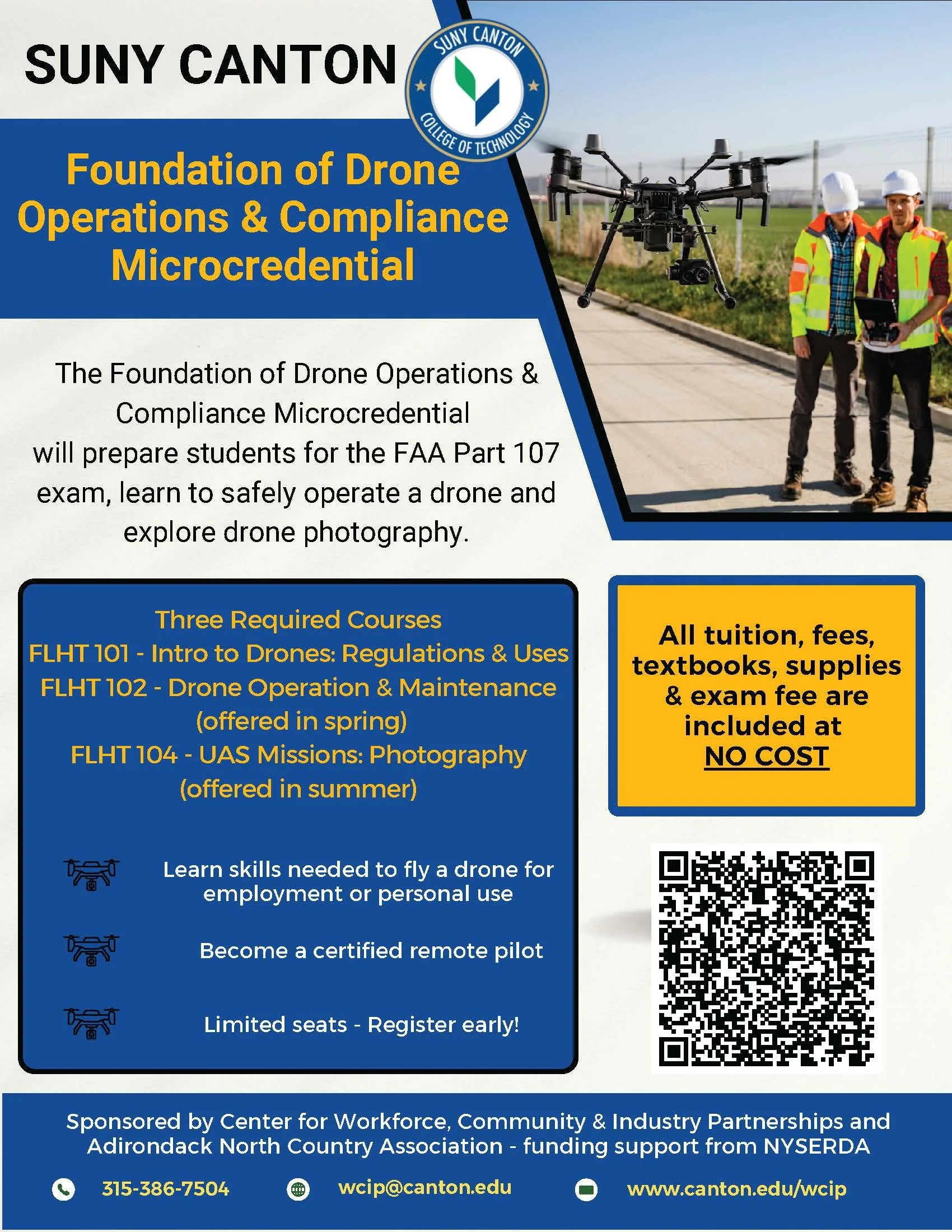 The first seven weeks of the course will be held virtually, with the rest being in-person at SUNY Canton to offer hands-on drone flying experience. The course will begin on January 19, 2026 - Tuesdays and Thursdays from 5:00-6:50 PM.